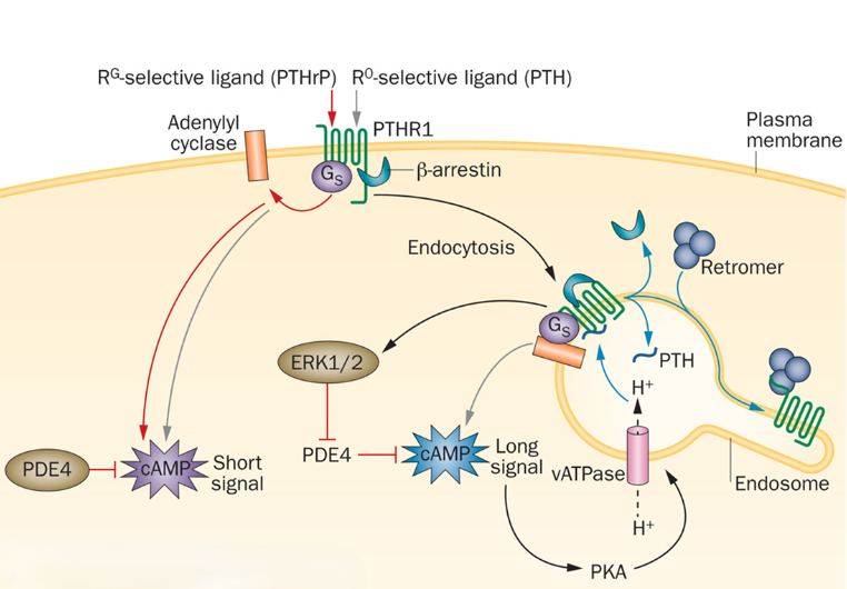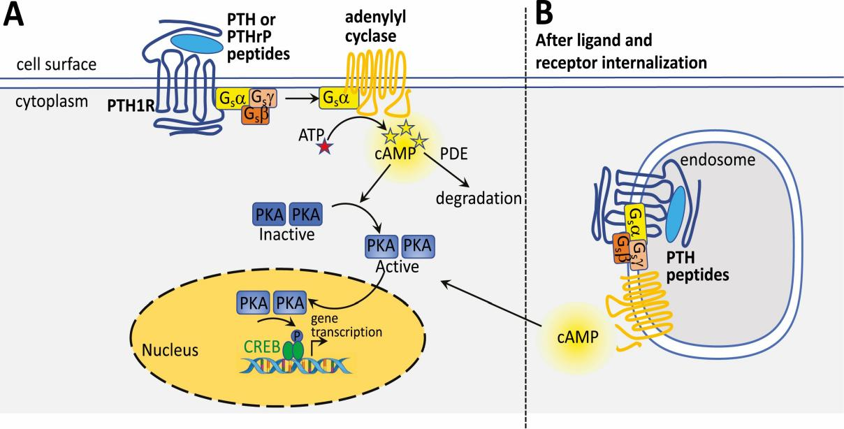 PTH1R的核心結(jié)構(gòu)包括N端胞外結(jié)構(gòu)域(ECD)、7次跨膜結(jié)構(gòu)域(7TMD,由七個(gè)跨膜α螺旋和連接環(huán)組成)和C端胞內(nèi)結(jié)構(gòu)域。PTH 或 PTHrP 的氨基末端肽與PTH1R的ECD結(jié)合后,會(huì)導(dǎo)致 G 蛋白的激活,主要是 Gα,它激活腺苷酸環(huán)化酶,并以磷酸二酯酶限制的方式催化 cAMP 的產(chǎn)生。當(dāng)達(dá)到足夠的局部細(xì)胞內(nèi)濃度時(shí),cAMP 激活 PKA,PKA 易位到細(xì)胞核,在核內(nèi)磷酸化 CREB,從而能夠在特定基因上轉(zhuǎn)錄 cAMP 響應(yīng)元件,從而調(diào)控成骨細(xì)胞分化和鈣磷代謝。PTH1R 信號(hào)傳導(dǎo)可以發(fā)生在細(xì)胞表面,或者對(duì)于 PTH 氨基末端肽,它也可以發(fā)生在配體和受體內(nèi)化后。