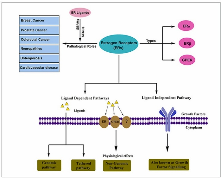 在過去的幾十年中,ER在前列腺癌、結(jié)腸直腸癌和乳腺癌等各種癌癥中的作用已被深入研究。研究表明,雌激素受體不僅會介導(dǎo)乳腺癌的發(fā)生,而且在許多其他的人類病理(如心血管疾病、骨質(zhì)疏松癥和肥胖、阿爾茲海默癥、自身免疫性甲狀腺疾?。┲邪l(fā)揮作用。