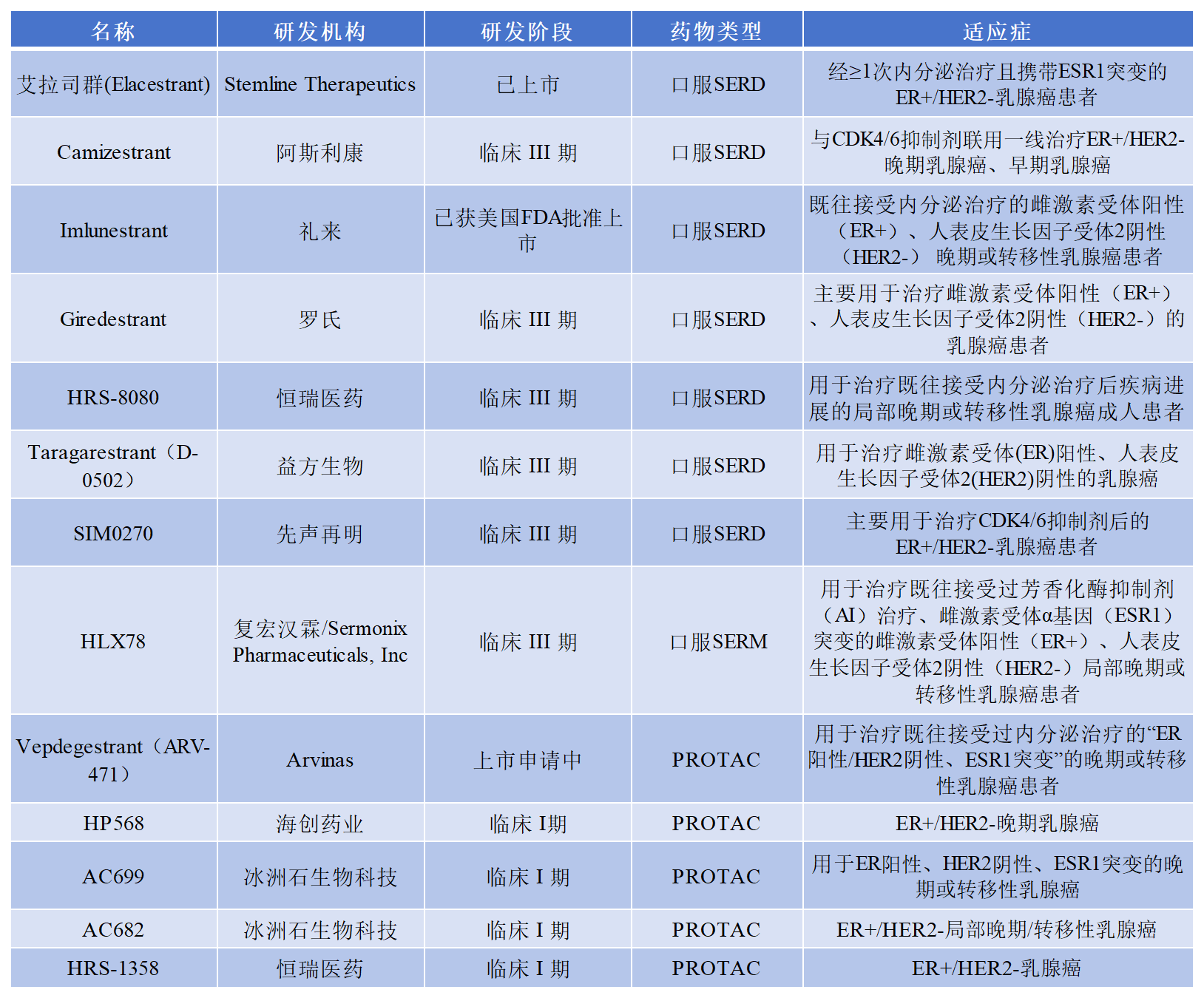 從他莫昔芬、芳香化酶抑制劑到氟維司群,傳統(tǒng)療法逐漸暴露出耐藥性、注射給藥不便等局限性。新一代口服選擇性雌激素受體降解劑(SERD)以創(chuàng)新作用機(jī)制和口服優(yōu)勢,有望重塑HR+/HER2-乳腺癌的治療格局。另外,還有降解 ER的PROTAC等藥物在研發(fā)中。以下為部分已上市或處于臨床階段的藥物信息: