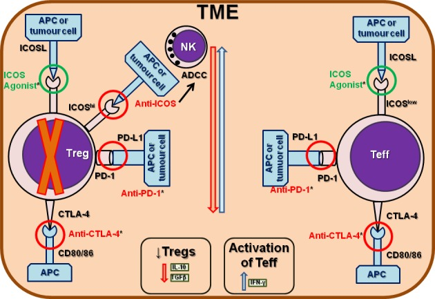 ICOS/ICOSL信號(hào)途徑已被證明可以促進(jìn)抗腫瘤T細(xì)胞反應(yīng)(當(dāng)在Th1和其他Teff中激活時(shí))或Tregs中觸發(fā)的前體反應(yīng)。因此,針對(duì)這一途徑的激動(dòng)性和拮抗性單克隆抗體正在被研究用于癌癥免疫療法。在臨床前研究中,ICOS激動(dòng)性單克隆抗體增強(qiáng)了抗CTLA-4的作用。有文獻(xiàn)表明ICOS敲除小鼠對(duì)抗CTLA-4反應(yīng)不佳,表明ICOS信號(hào)傳導(dǎo)是有效抗腫瘤反應(yīng)所必需的,可能由Teff介導(dǎo)。因此,與單獨(dú)使用抗-CTLA-4相比,同時(shí)使用CTLA-4和ICOS刺激具有更好的抗腫瘤效果。有趣的是,使用抗-CTL a-4或抗-PD-1治療的小鼠和患者擴(kuò)大了ICOShi(FoxP3-)CD4+和CD8+T細(xì)胞亞群,表明ICOShi T細(xì)胞可能是臨床反應(yīng)的重要生物標(biāo)志物,從而使治療受益。與癌癥免疫療法靶向的其他途徑相比,單獨(dú)使用ICOS似乎效果較差,主要是因?yàn)镃D4+Tregs占主導(dǎo)地位。使用ICOS激動(dòng)劑或拮抗劑Abs與CTLA-4或PD-1/PD-L1聯(lián)合使用有可能產(chǎn)生強(qiáng)效的協(xié)同作用。