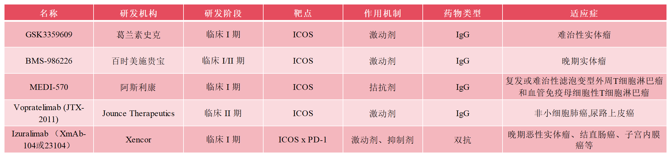 ICOS/ICOS-L信號(hào)通路在腫瘤領(lǐng)域具有雙重作用。一方面,ICOS/ICOS-L的共刺激信號(hào)可參與抗腫瘤T細(xì)胞反應(yīng)。另一方面,ICOS信號(hào)傳導(dǎo)也具有促腫瘤作用?,F(xiàn)階段正在研發(fā)的ICOS抗體主要包括激動(dòng)劑和拮抗劑兩種。激動(dòng)劑主要通過(guò)和ICOS結(jié)合增強(qiáng)免疫作用。拮抗劑主要是為了阻止調(diào)控ICOS陽(yáng)性T細(xì)胞累積,抑制CD4+浸潤(rùn)性T細(xì)胞分泌IL-10,以此消除Treg介導(dǎo)的免疫抑制,并可能增強(qiáng)針對(duì)腫瘤細(xì)胞的細(xì)胞毒性T淋巴細(xì)胞(CTL)介導(dǎo)的免疫應(yīng)答,主要用于血液癌癥。目前在全球范圍內(nèi)尚無(wú)針對(duì)ICOS靶點(diǎn)的藥物獲批上市。目前部分藥企研發(fā)進(jìn)展如下: