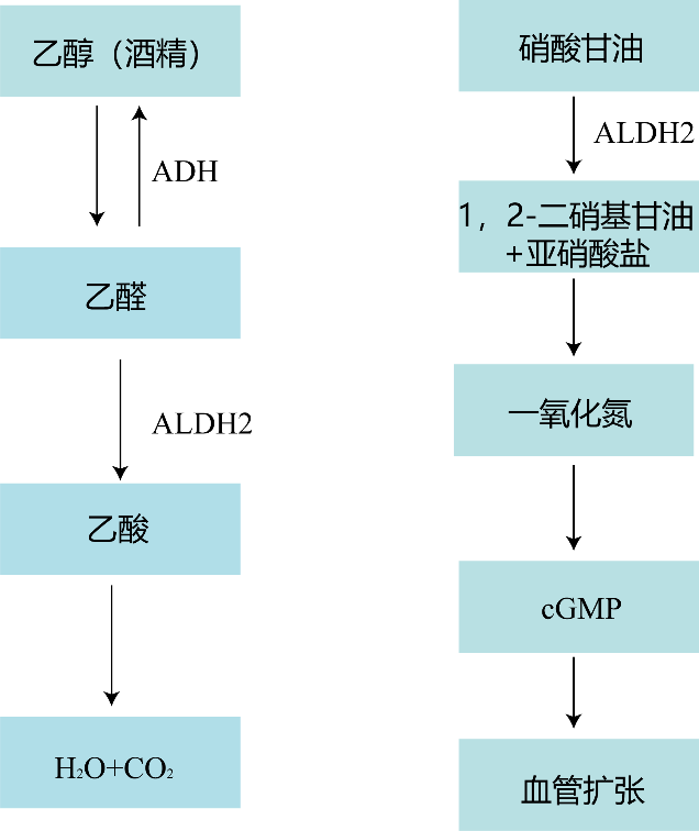 ALDH2(acetaldehyde dehydrogenase 2),線粒體乙醛脫氫酶2,位于第12號(hào)染色體的12q24.2位置,全長(zhǎng)43,438bp,共有15個(gè)外顯子,編碼由517個(gè)氨基酸殘基組成的蛋白質(zhì)。ALDH2是人體催化硝酸甘油生物轉(zhuǎn)化的主要途徑,該酶同時(shí)具有脫氫酶和酯酶的催化活性,其酯酶活性可以通過將硝酸甘油脫硝產(chǎn)生NO,進(jìn)而引起血管擴(kuò)張。